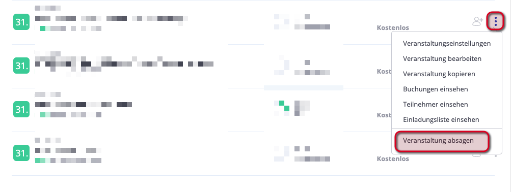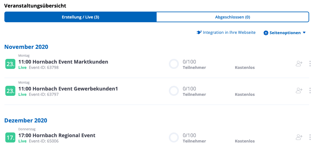 "Abgeschlossene" Veranstaltungen können im Tab-Menü oben eingesehen werden. Zudem werden sie ausgegraut dargestellt.