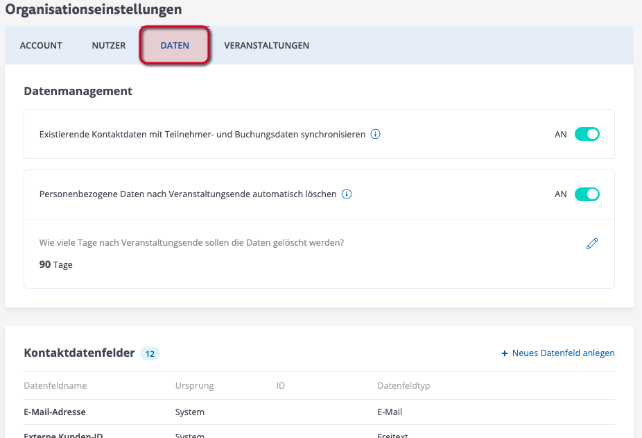 Über das Zahnradsymbol oben im blauen Balken, gelangen Sie zu den Organisationseinstellungen und finden dort unter dem Reiter "Daten" und dem Unterpunkt „Kontaktdatenfelder“ die Einstellungsmöglichkeiten.